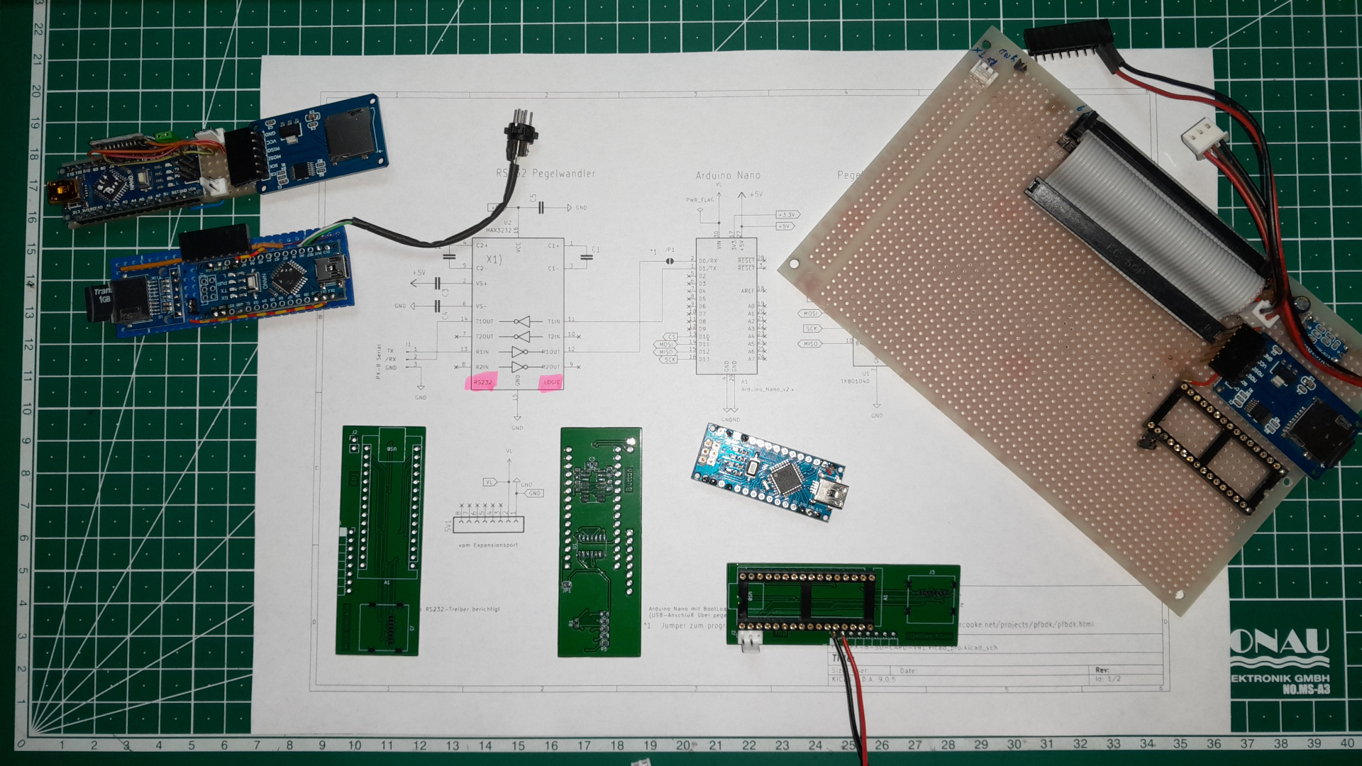 Fehlersuche: Schaltplan nochmals genauer angeschaut und siehe da, am RS232-Pegelwandler habe ich die Logik- und RS232-Seite vertauscht, „tausendmal“ geprüft – betriebsblind. Mit Scalpell und Fädeldraht gerichtet, hierzu die beiden freien Sender, Empfänger genutzt.