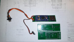 mit der Überlegung alles noch etwas kleiner zu gestalten habe ich das Nano-Modul gegen ein proMini 3,3V 8Mhz getauscht. Hierdurch fällt der SPI-Pegelwandler und die USB-Schnittstelle weg, die 8Mhz sind auch kein Problem wie der Urheber mir mitteilte. Projekt neu kompiliert und mit AVR-Studio 4 per ISP ins Modul geschrieben, hier hatte die Arduinoplattform versagt, „keine Verbindung zum Promer“.