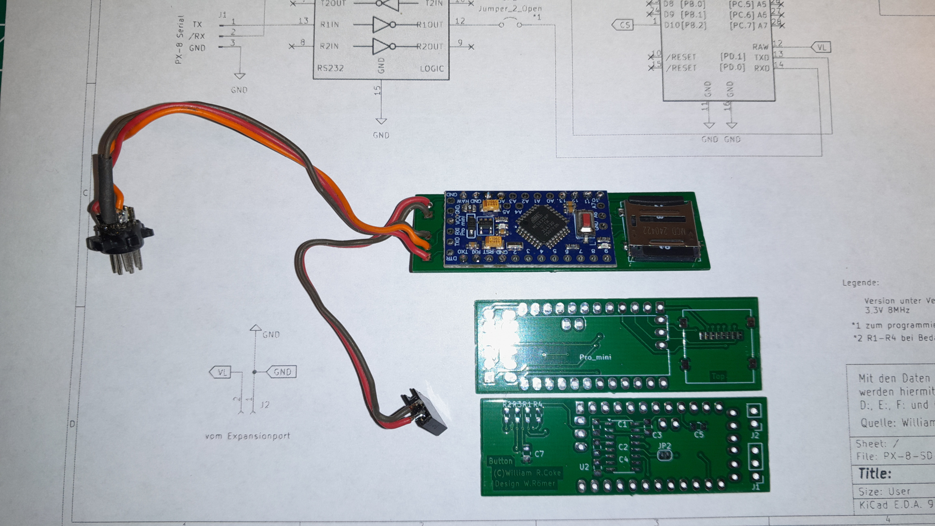Der Nano nimmt eigendlich viel zu viel Raum ein, zumal ich ja nur die V24, 3,3V Spannungsregler und das SPInterface benötige. Der PX-8 stellt mir die 5Volt bereits zur Verfügung und ein USB-Interface, was auch noch geschummelt ist, wird auch nicht benötigt. Das Programm kann genauso über das SPI geladen werden. Schön wäre eine Umstellung auf 3,3V, damit hätte sich der SPI-Pegelwandler, mit all seinen „Fallstricken“ erledigt und das Platinchen könnte nochmals deutlich schrumpfen. Vorraussetzung ist, das die Software auch noch mit 8Mhz funktioniert, schauen wir mal was der Urheber William R.Coke dazu sagt.