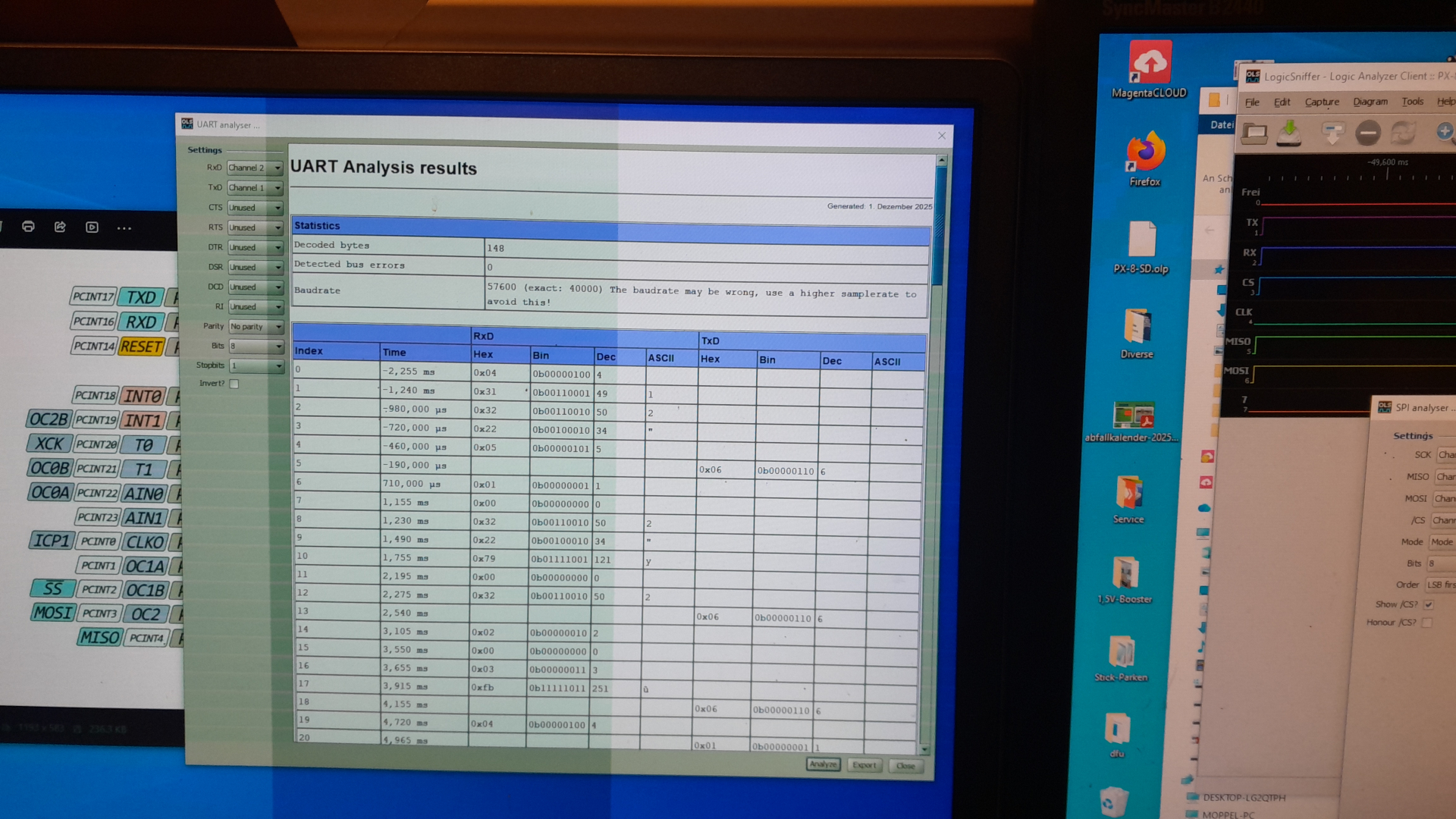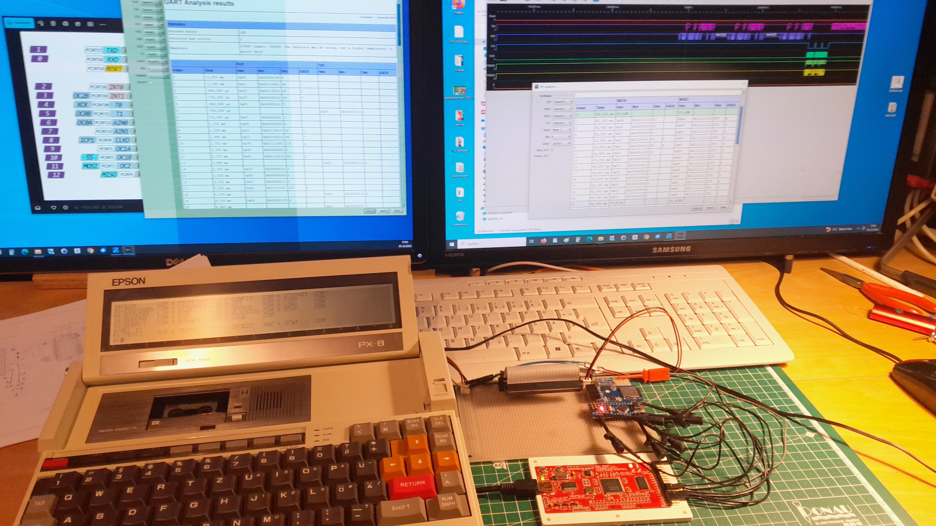 Das sieht nicht nur auf dem PX-8 gut aus, auch der Analyser kann da was mit anfangen. Im Kanal 1 und Zwei wird die V24 abgebildet und das SPInterface auf den Kanälen 3-6,
