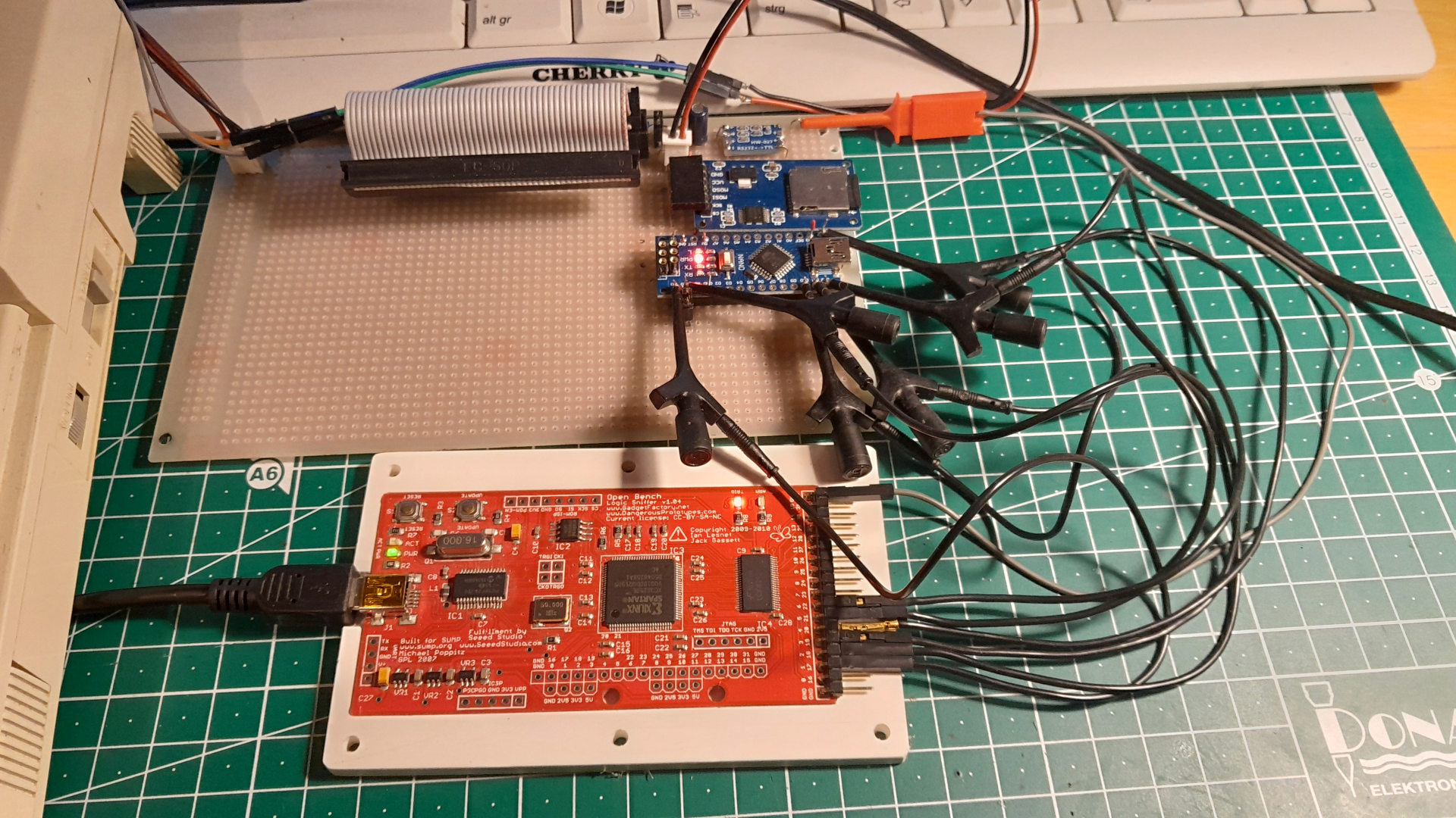 Ist aber nicht der einzigste Fehler, denn die Karte wird nicht angesprochen. Für die Fehlereingrenzung eine weitere Platine mit Sockel ausgestatet, so kann ich den Arduino zwischen dem alten Aufbau, der ja einwandfrei funktioniert, tauschen um vergleichsmessungen durchzuführen.