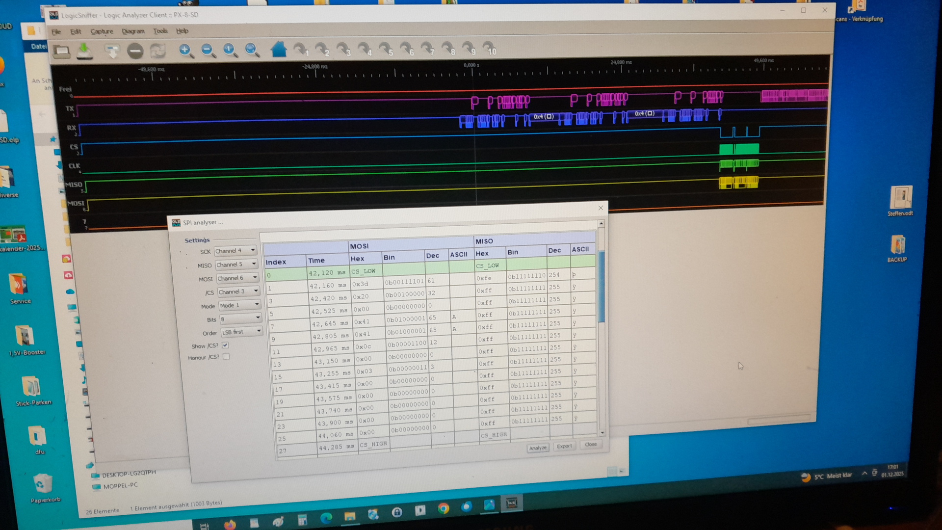 der Kanal 0 hat leider mal das zeitliche gesegnet und bleibt unberücksichtigt. Hier sind man schön das die Anfrage vom PX quitiert und das PSI angesprochen wird um die Daten, hier Dir d:, aus der SD-Karte abzuholen – Alles Wunderbar…