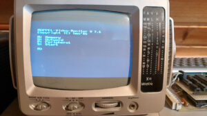 mit dem üblichen 6545. Über die beiden Jumper (oberhalb vom EPROM u.RAM) kann die Bildgröße 18 x 40 bzw. 24 x 80 eingestellt werden. im EPROM befindet sich der Zeichensatz in einer 8 x 12er Matrix, damit gibt es ein ausgezeichnetes Schriftbild mit echter unterlänge – deutlich besser als die üblichen 5 x 8er Matrix. Neben dem BAS-Signal gibt es auch Video-Ausgänge VID, HS und VS für entsprechende Monitore und schließlich noch ein UHF-Modulator fürs Fernsehen – macht aber nur in der 40Zeichen/Zeile Sinn.