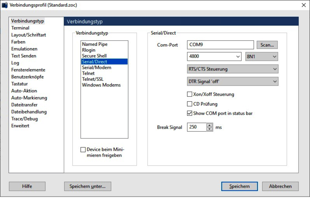 Für die Verbindung wird noch ein Adapter 25pol auf 9pol D-Sub benötigt: Adapter-87er-RS232-9pol-Dsub
